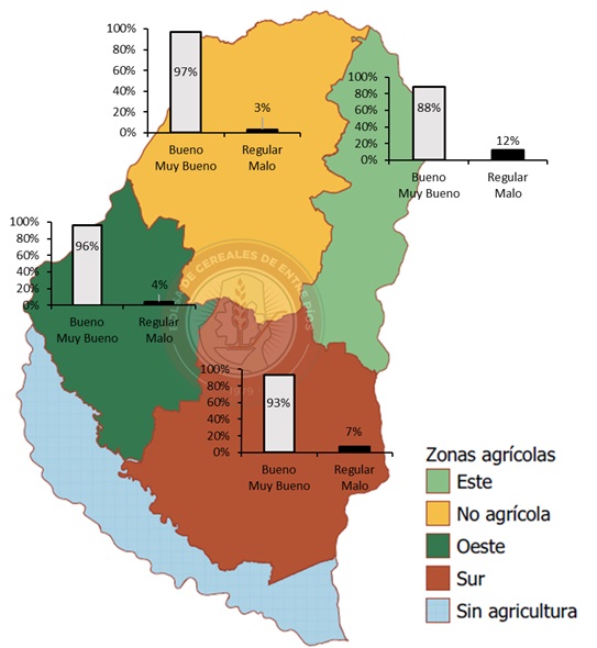 El estado fenológico del cultivo es amplio y abarca desde los últimos lotes implantados a comienzos de julio, que se encuentran en emergencia, hasta los primeros sembrados en la segunda quincena de mayo, que actualmente están en pleno macollaje.