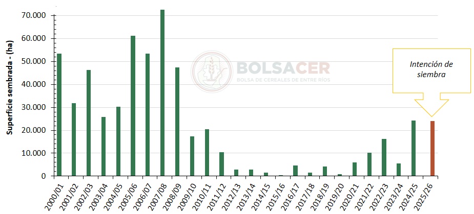 Es importante recordar que, en el ciclo 2007/08, la superficie sembrada con girasol en la provincia de Entre Ríos alcanzó un máximo de 72.695 hectáreas. A partir de ese momento, se registró una pronunciada caída, asociada a precios poco atractivos y daños ocasionados por palomas.