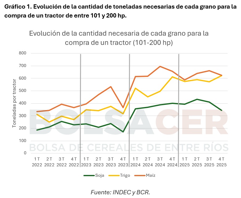La dinámica en el período 2022-2025 es contundente: un fuerte deterioro del poder de compra de los granos frente a los bienes de capital. En términos prácticos, al productor le cuesta cada vez más volumen de su cosecha adquirir el mismo tractor.