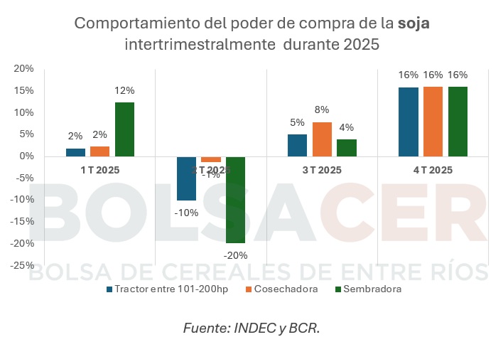 Durante el año 2025, observamos una mejora en el poder de compra de la soja durante el primer trimestre, que rápidamente se revirtió en el segundo trimestre del año, principalmente en los tractores y las sembradoras. A partir del 3er trimestre, con el paulatino aumento en la cotización en dólares de la oleaginosa, recuperó capacidad de compra frente a los tres tipos de maquinaria.
