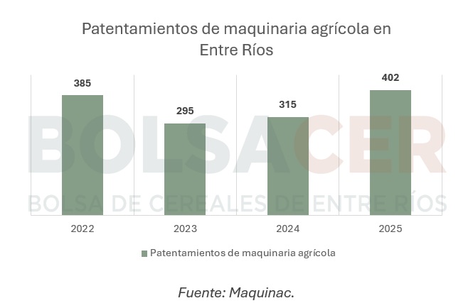 En Entre Ríos, según datos de ACARA Y Maquinac, durante el año 2025 se patentaron 402 máquinas agrícolas, ubicándose 4° en el ranking nacional. Los patentamientos han superado los observados en 2022 y vienen en aumento desde 2023, año donde si bien la relación de precios haya sido mucho mejor que 2024 y 2025, los patentamientos cayeron por la sequía y falta de rentabilidad de los productores. Los últimos dos años, con la recuperación de la producción, el productor se encontró con una desmejora en sus términos de intercambio, pero que sin embargo se tradujo con una tendencia creciente en los patentamientos.