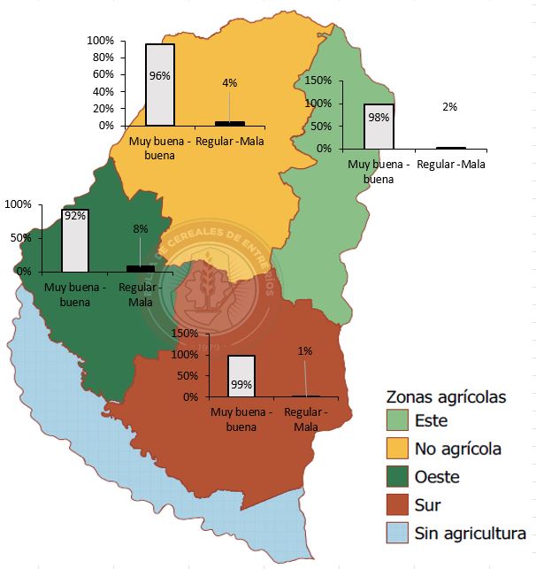 Figura 1: Condición del cultivo de maíz de primera por zonas productivas de Entre Ríos