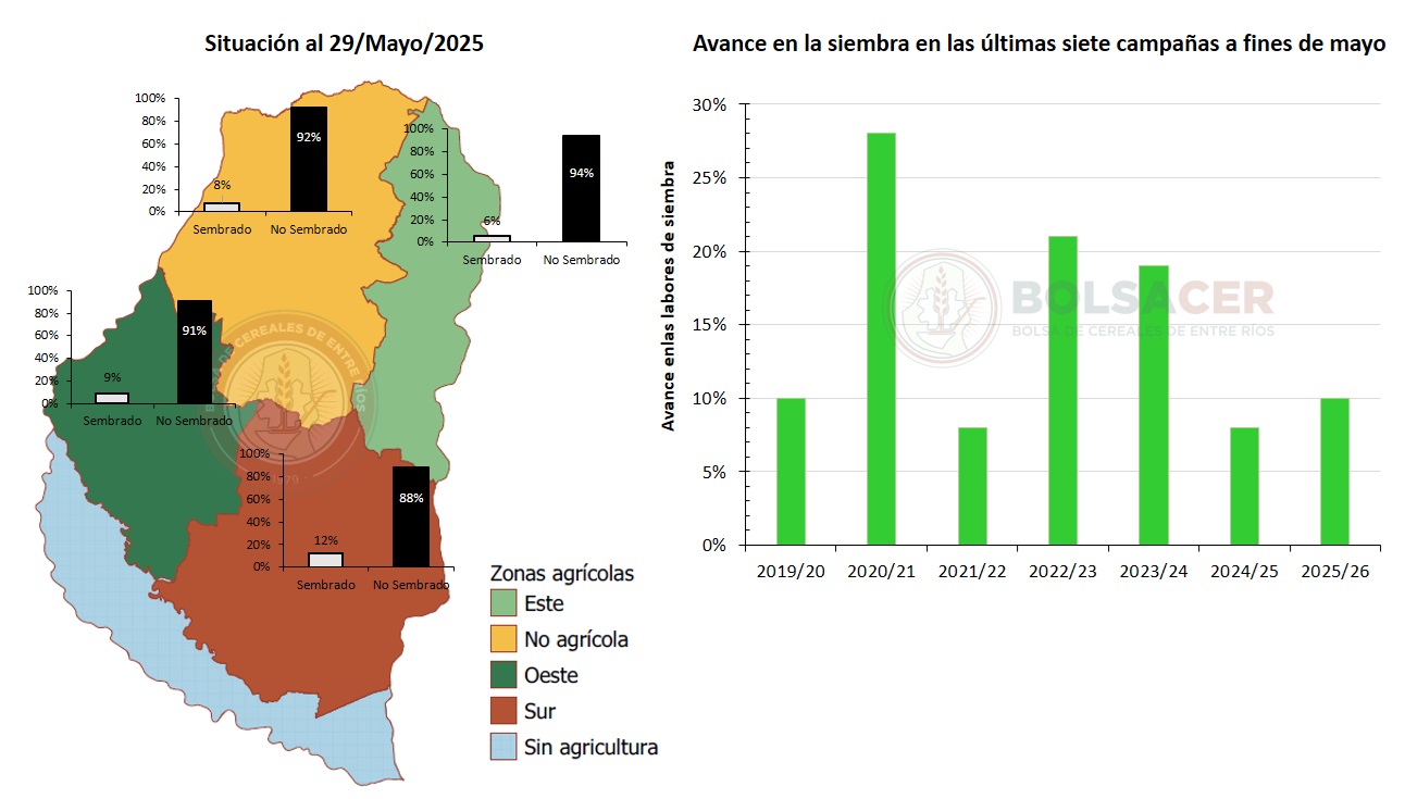 Con respecto al año pasado, el Sistema de Información de Bolsa de Cereales de Entre Ríos (SIBER) observa una leve diferencia del 2 %, mientras que si se compara al promedio de los ciclos 2019/20 – 2024/25 que tiene un promedio del 16 %, se detecta un leve retraso sobre la intención del 6 %.