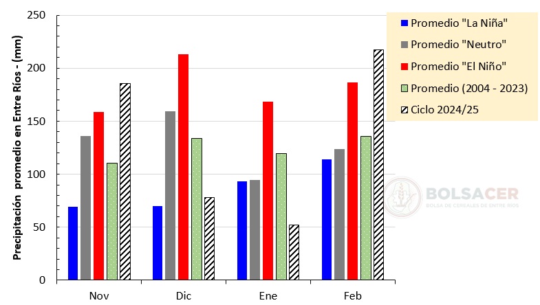 Figura 1: Precipitación promedio en el cuatrimestre noviembre – diciembre – enero – febrero en función de la situación del Pacífico Ecuatorial, promedio general y ciclo 2024/25 en Entre Ríos.