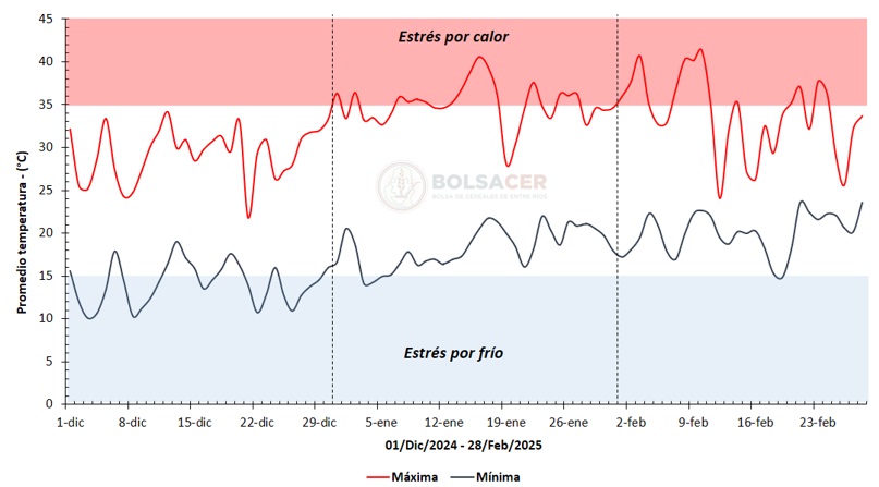 Figura 2: Promedio de la temperatura mínima y máxima del 01/Dic/24 al 28/Feb/25 en la provincia de Entre Ríos.