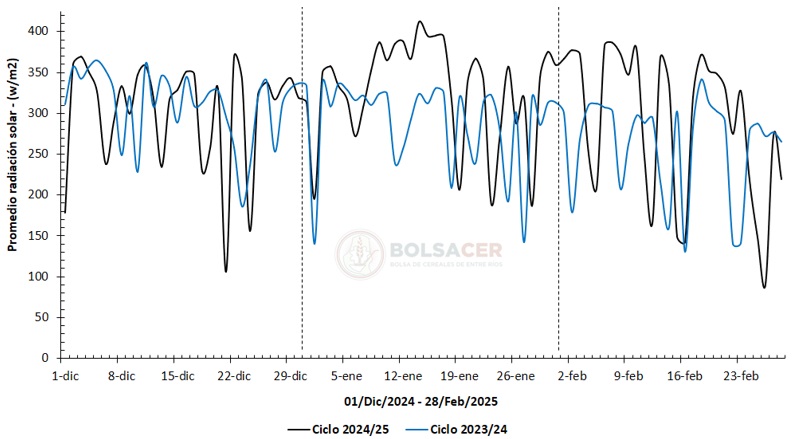 Figura 3: Promedio de la radiación solar diaria 01/Dic/24 al 28/Feb/25 en la provincia de Entre Ríos en los ciclos 2023/24 versus 2024/25.