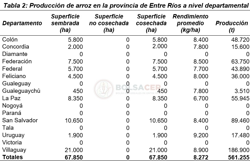 Los datos estadísticos sobre la superficie implantada con arroz a nivel departamental se presentan en la Tabla 2.