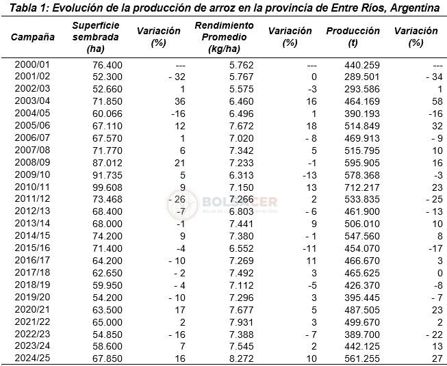 La Bolsa de Cereales de Entre Ríos da a conocer el informe correspondiente a la producción de arroz en el ciclo 2024/25 en la provincia de Entre Ríos, Argentina.