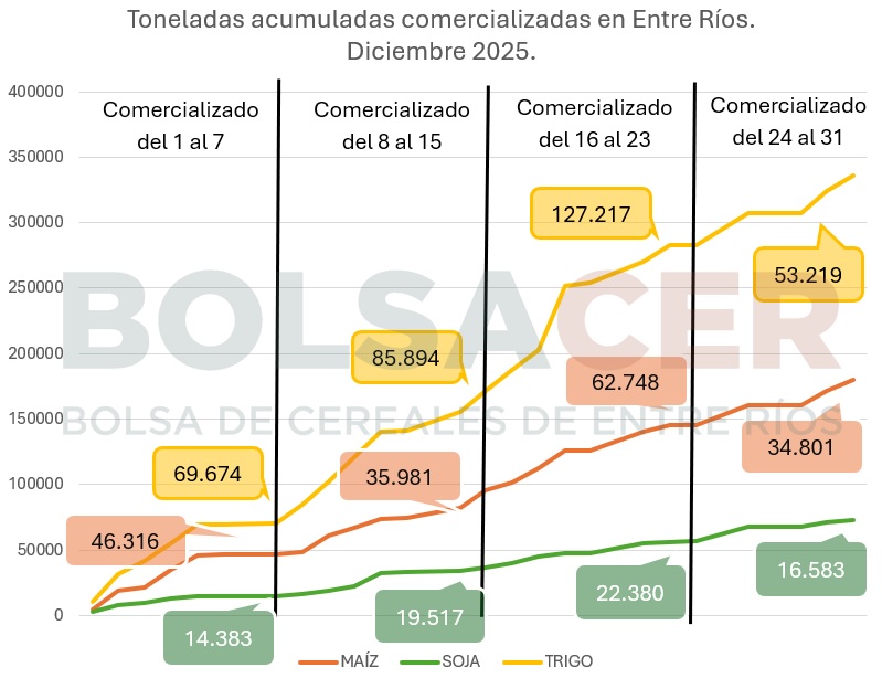 Figura 1. Toneladas comercializadas acumuladas en el mes de diciembre de 2025 en Entre Ríos. Fuente: BOLSACER en base a SIO Granos.