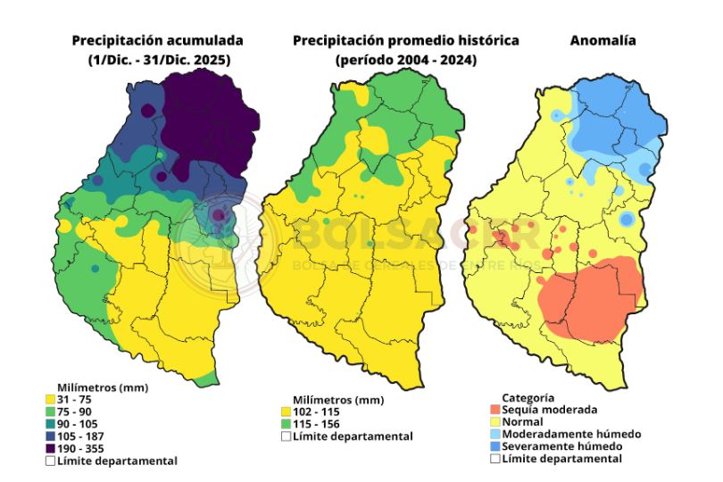 Figura 2: Precipitación acumulada en diciembre del 2025, promedio histórico para diciembre (2004–2024) y anomalía de diciembre del 2025.