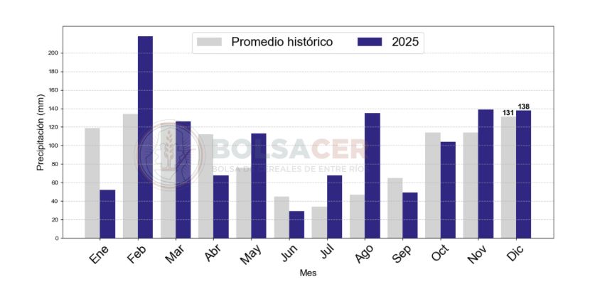 El promedio provincial de precipitación en diciembre de 2025 fue de 138 mm, superando en 7 mm al promedio histórico mensual de 131 mm, lo que representa un incremento relativo del 5 % respecto del valor esperado para este mes.