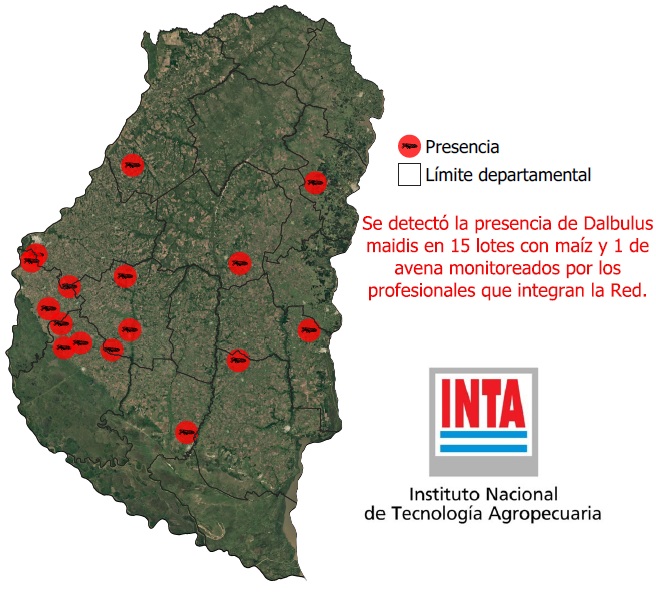 Se detectó la presencia de Dalbulus maidis en 15 lotes con maíz y 1 lote de avena monitoreados por los profesionales que integran la Red. En plantas voluntarias de maíz se registraron 12 adultos de chicharritas en 160 golpes de red (Dpto. La Paz) y 1,8 chicharritas por planta sobre un total de 50 plantas observadas (Dpto. Uruguay). Asimismo, se recolectaron 10 adultos en un verdeo de avena (Dpto. Nogoyá) (Ver mapa).