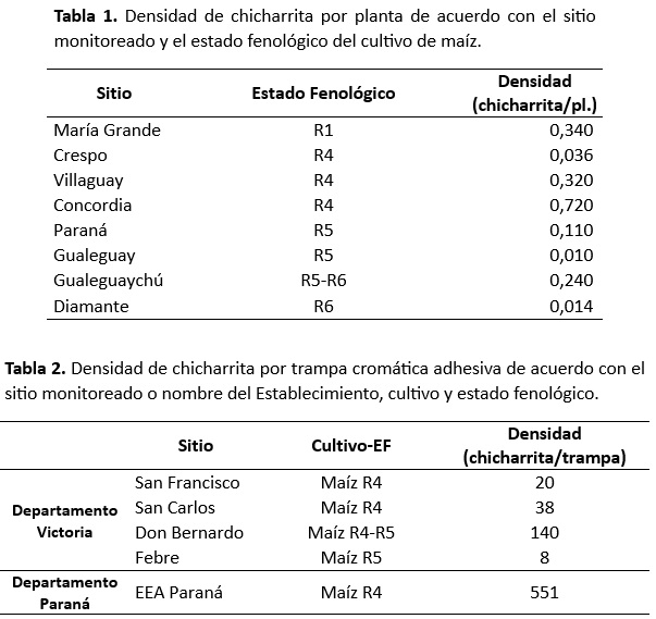 A continuación, se detallan los estados fenológicos y los valores correspondientes a la densidad poblacional de adultos de chicharritas por planta (Tabla 1, observación directa, 50 plantas de maíz o 160 golpes de red). Además, se presentan datos provenientes de las capturas en trampas cromáticas adhesivas (Tabla 2), pertenecientes a profesionales del Círculo de Ingenieros Agrónomos de Victoria (CIAV), de la AER Victoria y de la EEA Paraná del INTA.
