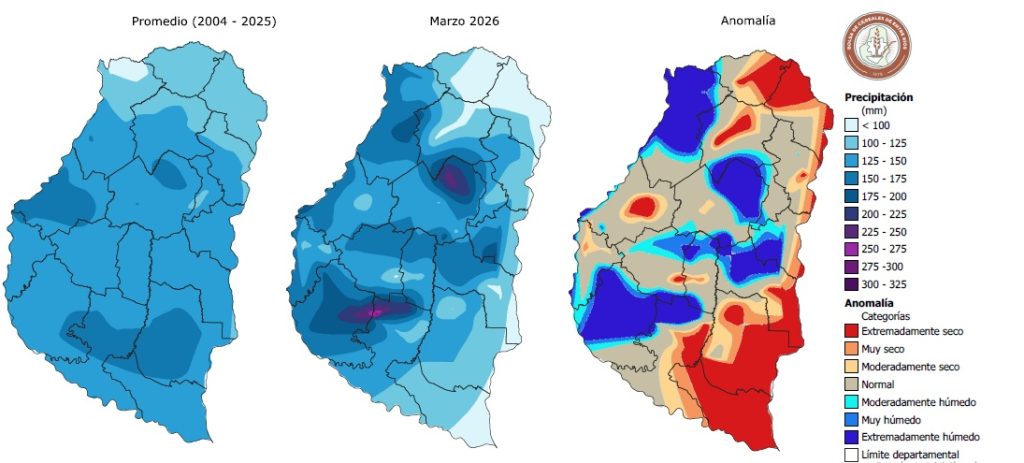 Figura 2: Distribución de la precipitación promedio de marzo (periodo 2004 – 2025), distribución de la preciptiación en marzo del 2026 y anomalía para la provincia de Entre Ríos.
