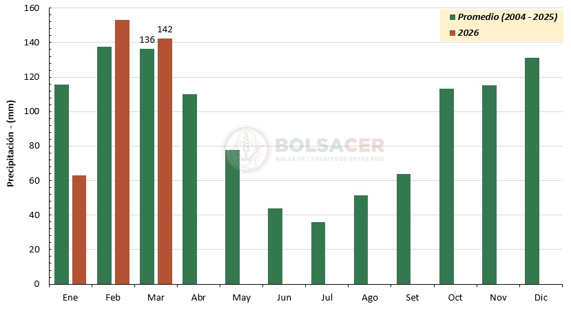 Figura 1: Precipitación promedio mensual en la provincia de Entre Ríos versus registros promedios del año 2026 de enero a marzo.