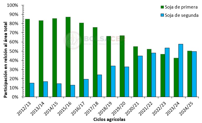 A nivel provincial, la participación de la superficie de soja de primera fue del 50,3 % y la de soja de segunda del 49,7 %.