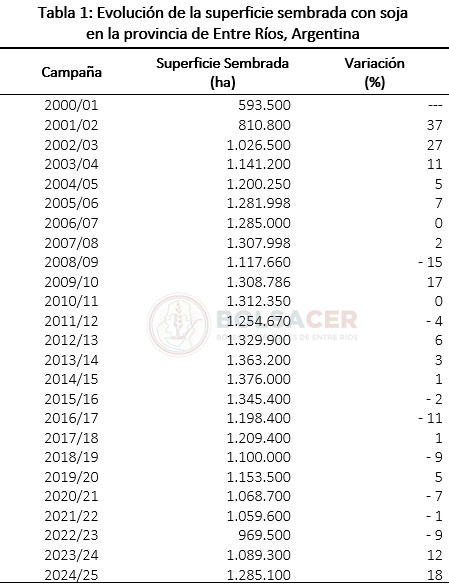 Los datos estadísticos sobre la evolución del área implantada con soja en Entre Ríos se presentan en la Tabla 1.