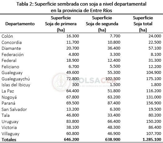 Los datos estadísticos sobre la superficie implantada con soja a nivel departamental se presentan en la Tabla 2.