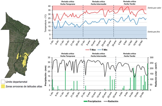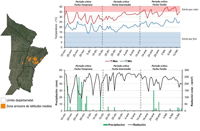 Figura 3: Ubicación de los lotes de arroz en latitudes altas y variables climáticas para el periodo crítico en función de tres fechas de siembra (temprana, intermedia y tardía).